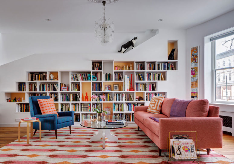 - This unique and colroful house was renovated for a couple of booklovers and their two cats, and it’s a perfect comfy space for all of them.