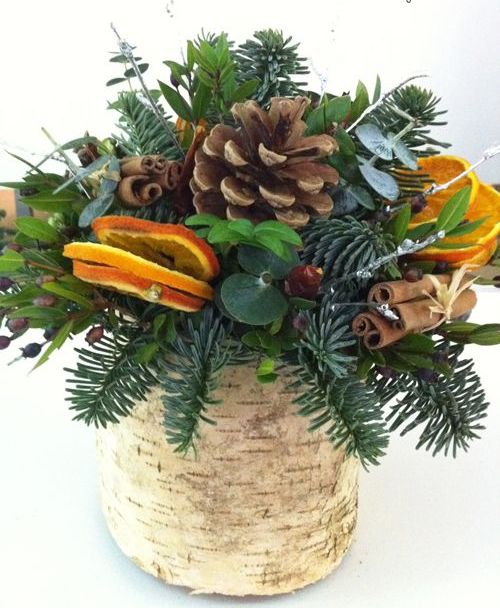 Picture of a vase wrapped with bark, evergreens, pincones, citrus and cinnamon sticks