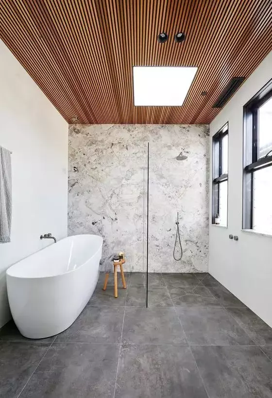 Picture of a contemporary bathroom with a stone accent wall, concrete tiles, a wood slab ceiling, neutral fixtures is chic