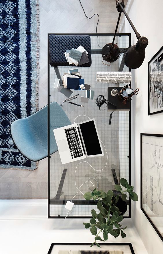 A glass desk is a perfect fit for a minimalist office – it just disappears in the air, which is ideal for such a clear space. A masculine home office will look chic and modern with a glass desk, take it all clear, completely made of glass. The accent can be made with a gorgeous chair or armchair, rock a cool one!