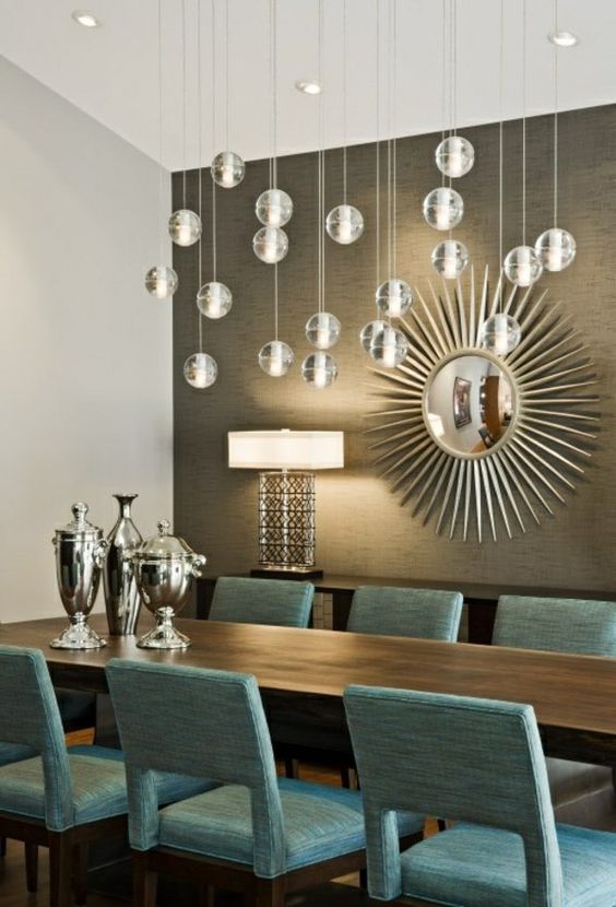 Picture of a refined formal dining room with a taupe accent wall, a dark stained table and turquoise chairs, bubble lights and a mirror